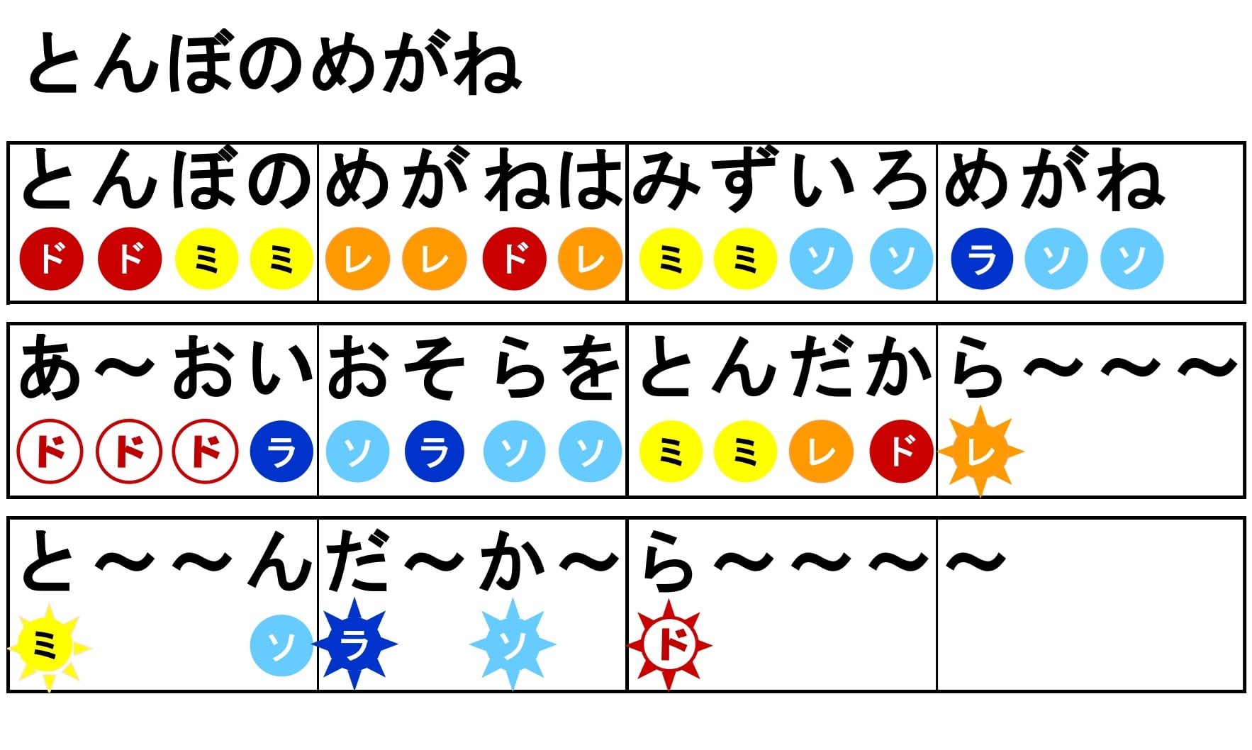 メロディベル演奏用「とんぼのめがね」の色楽譜(PDFファイル)です。